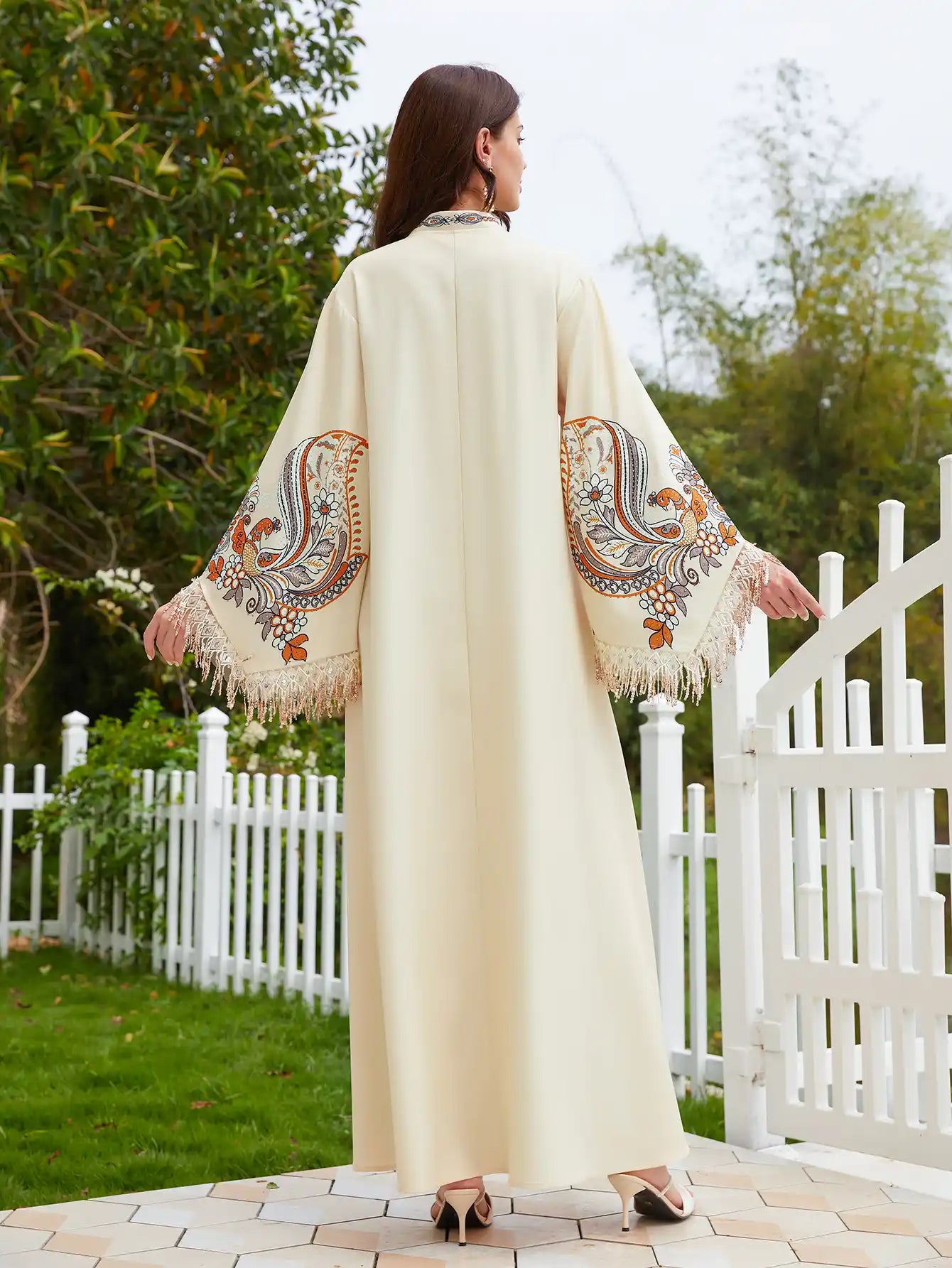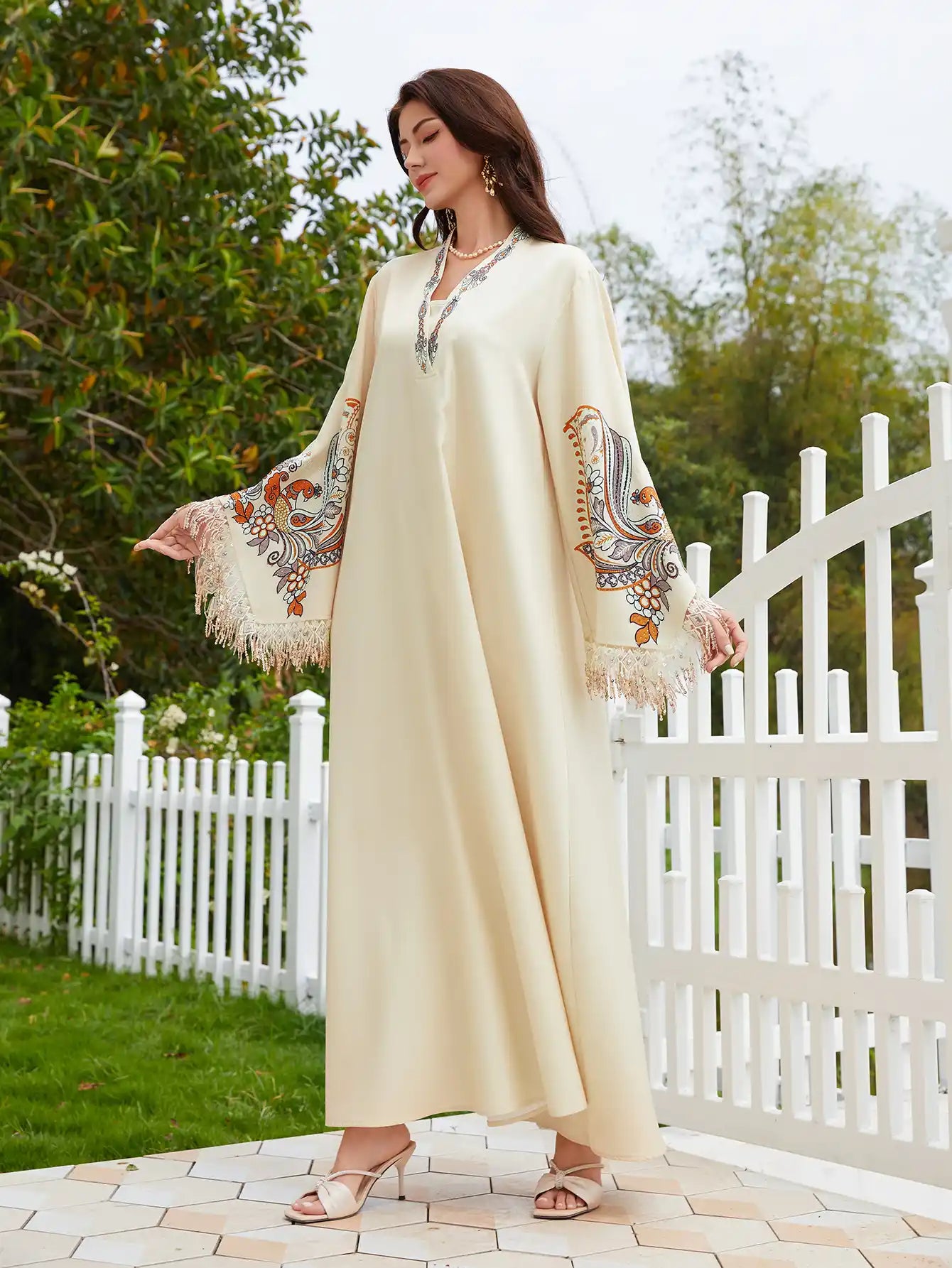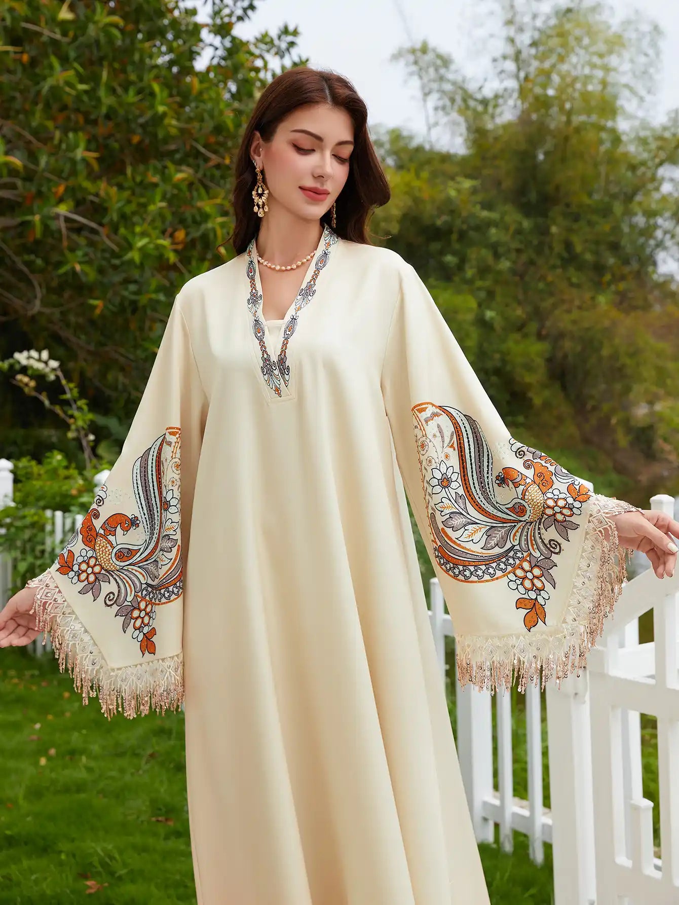 NC44 Muslim Robe V-neck Printed Tassel Arabic Dress Abaya